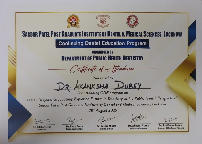 Dr. Akanksha Dubey is an alumnus of the prestigious Saraswati Dental College & Hospital. She joined BDS in Batch 2011-12. She completed her Internship in Jan, 2019. She immediately joined her alma mater as a faculty in February 2019. She has also done Post Graduate Diploma in Quality Management & Accreditation in Healthcare Organization (QM&AHO) from Academy of Hospital Administration (AHA), NOIDA. Currently, she is working as a lecturer in the department of Public Health Dentistry.